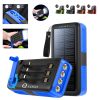 The solar power bank is made of Polymer and ABS. The charger not only can charging on the light but also supports electric charge. It has three USB output ports and two input ports in a good looking. You can use it as a flashlight. There is an indicator shows the power. It is would secure your safety during outdoor, travels, office, camping, etc.