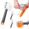 The straight peeler is made of stainless steel and PP. The handle has a finger anti-slip design. There are hanging holes at the rear. The cutter head is a right-angle design with a hollow design in the middle.