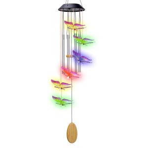 Butterfly wind chime light is IP64 waterproof material. They recharge themselves in sunlight and glow at night. The shape is a butterfly design. A bell hangs from each thread.