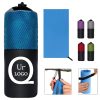 The towel is made of micro-fiber breathable materials and food grade silicone pouch and metal buckle. The towel is silky soft, comfortable feel, and quick to dry. The towel is large enough to be a headband around your neck or head to meet all your needs. The towel is light weight and compact. The towel is easy to bring on your travel, hiking or camping and doesn’t take much space in your bag. There is imprint space to imprint your logo.