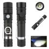 Spotlight flashlight is suitable for long-distance lighting. It can be charge by USB cable, through power bank, computer, car charger, wall charger, low light modes for 2.5 hours use. It is easy to change 4 modes by pressing the switch button gently. The strobe light is suitable for the alarm effect in emergency situations. Tactical flashlight is diamond-shape structure which is made of aluminum alloy.