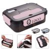 The double compartment lunch box is made of fart 304 stainless steel and PP plastic. The lid has hidden handles, silicone vents, silicone seals and leak-proof snaps that can also be used as a stand. It can be heated in the microwave. Insulation bag not included.