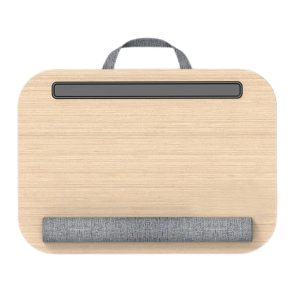 The lap desk is made of environmentally friendly wood panels and bolster cushions. The front side has a wrist pad and a recess for laptop and cell phone. The back side has two pillow pads to protect the knees. There is a carry handle on the side.