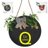 This door hanging sign is made of wood. It can be customized with different letters, messages or patterns. It comes with a bow and plastic flowers as you can see in the picture.