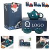 The portable tea set is made of ceramic and it includes a teapot, 4 teacups and a storage bag. The teapot has a streamlined spout, a water ripple design on the lid, a walnut heat shield on the outside, and it has a built-in stainless steel strainer.