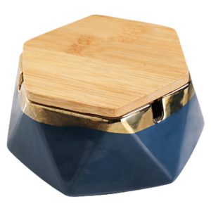 This ceramic ashtray has a bamboo lid, three notches and a geometric design for the look.